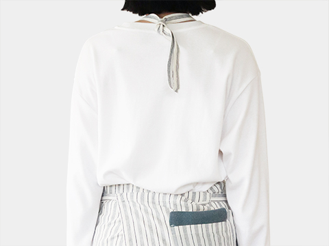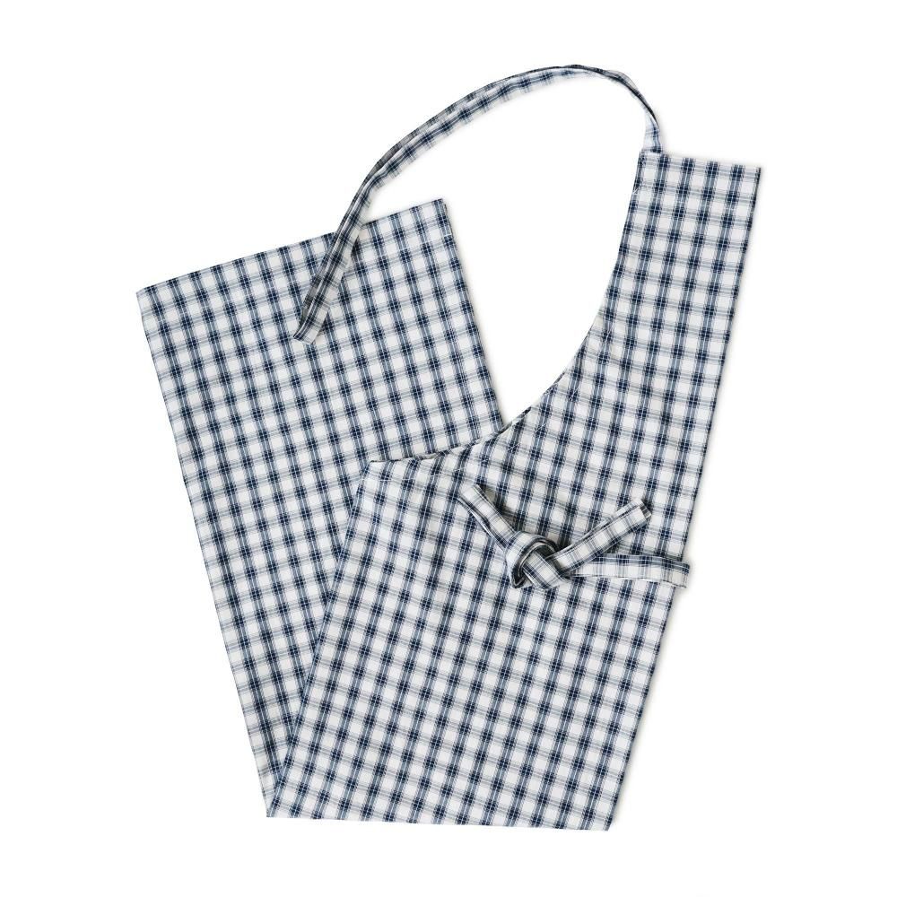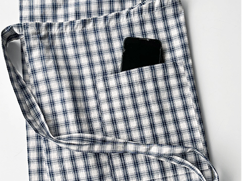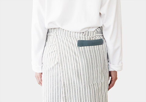 サンクオリジナルの首掛けエプロンをリニューアルして作りました。全体の長さを長めにして、首にかける紐を長く作り結んで調整する形にしたので、頭の大きめの方や男性もより使いやすくなりました。また、ポケットをお尻側につけることにより、前から見たスタイルがよりすっきりしました。