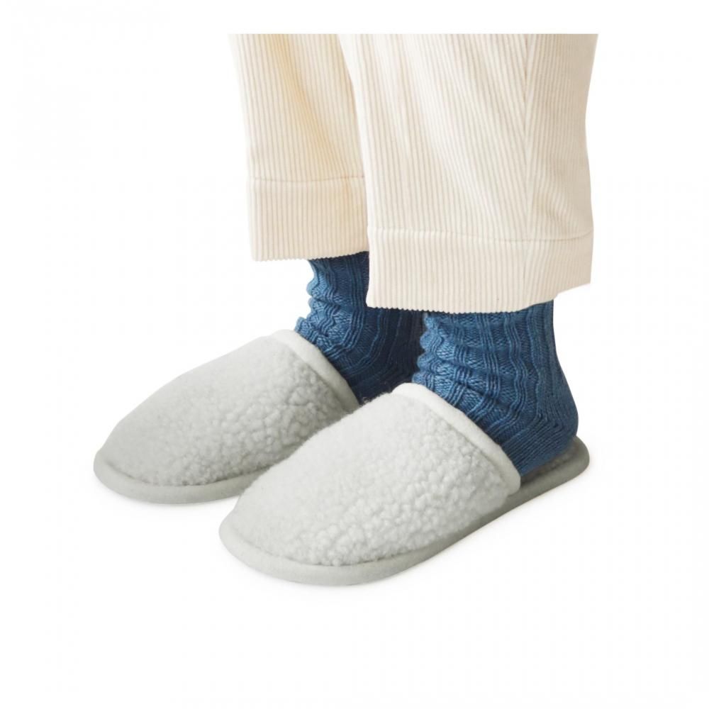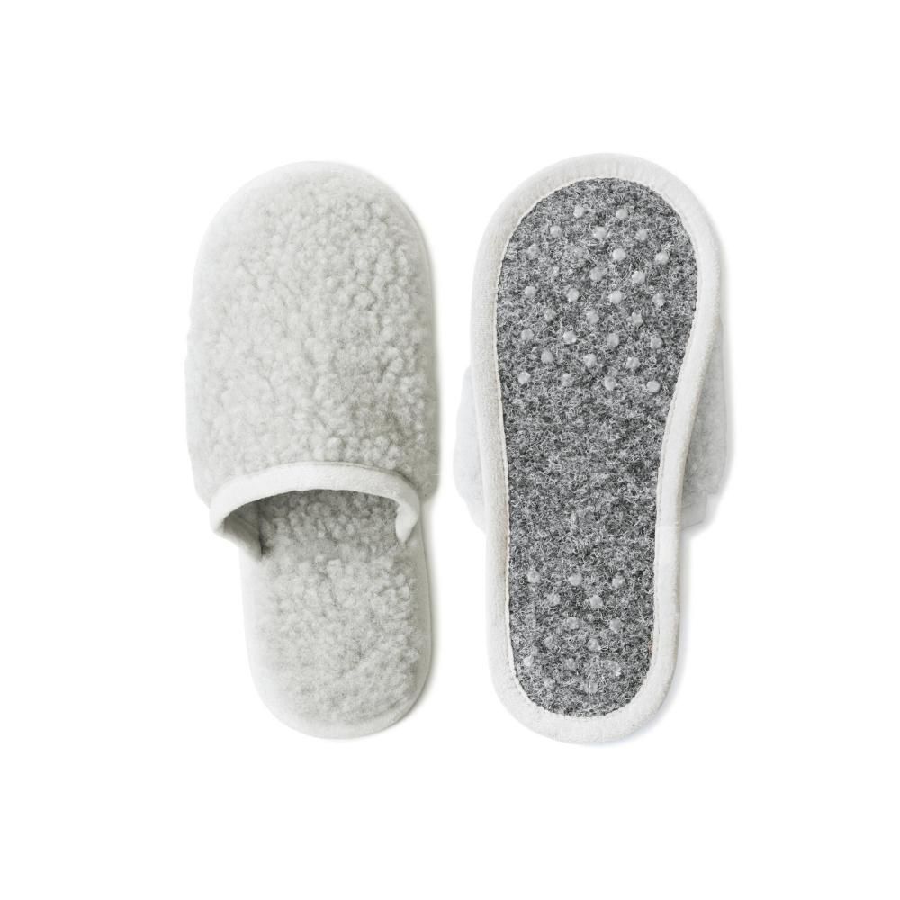 ラトビアのニットメーカーがつくるウールのスリッパです。羊のようなモコモコしたスリッパは、足に触れる部分は全てメリノウールなので、余分な水分を放出しやすく保温性が高いです。ふわふわした肌触りも気持ち良く、お家で洗うこともできるので、素足で履くのもおすすめです。ポリエステルの底面は強度がありつつ柔らかいため、しゃがみやすく、家事などの作業にも向いています。
